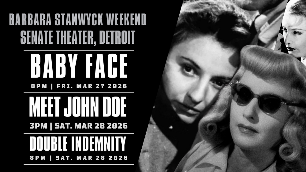 Appearing in nearly 100 films from the late 1920s and into the middle of the 1960s, Barbara Stanwyck was easily one of the brightest stars of the Hollywood’s Golden Age. From the transition to talkies to the dissolution of the “studio system” she was a consistent marquee presence and remains an icon. The Senate is excited to bring you three of her finest films on our big screen for a weekend of melodrama, socially conscious dramedy, and criminal scheming.